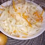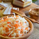 Учитывая, что при заквашивании не использовался сахар и была использована ржаная мука, капуста может показаться вам кислее обычной и более "ядрёной". Поэтому, при подаче можно слегка посыпать её сахаром, перемешать, оставить на 5-10 минут, потом полить маслом и подавать.