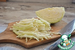 У капусты удалите верхние листья. Ополосните под водой, обсушите и нашинкуйте любым способом. Пару-тройку целых листьев отложите в сторонку, они пригодятся далее