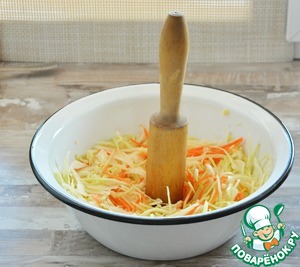 И деревянной толкушкой слегка "потопчите" капусту. Не надо её сильно мять или растирать. Просто 5-7 раз постучите толкушкой вверх-вниз и перемешайте капусту с морковкой.