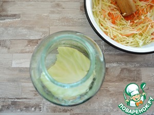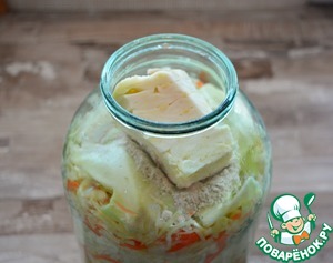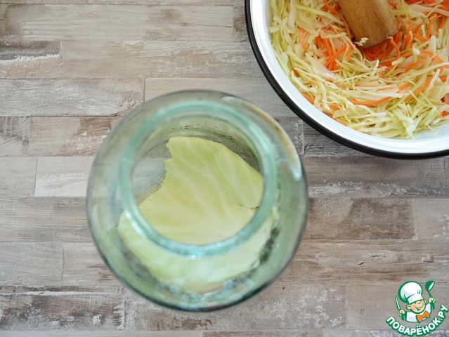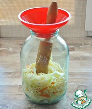 И укладывайте посоленную-помятую капусту в банку, приминая её толкушкой. Так делайте пока банка не заполнится. Обычно в трехлитровую банку входит 2-2,5 кг капусты