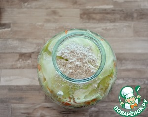 Сверху закройте капусту капустными листьями и насыпьте 1 ст. л. ржаной муки