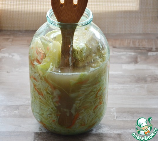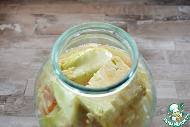 Оставьте капусту в комнате на 3-5 дней. На второй день обычно начинается обильное выделение рассола, поэтому банки лучше ставить на поднос или что-то подстилать. Банки накрыть марлечкой или просто прикрыть перевёрнутыми крышками