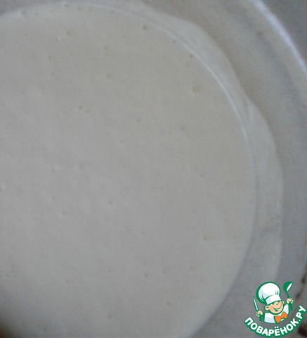 Кефир смешать со сметаной. Добавить соль, сахар и соду. Смесь вспенится. Влить растопленное сливочное масло.