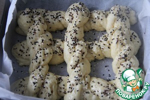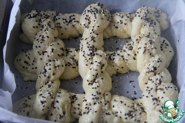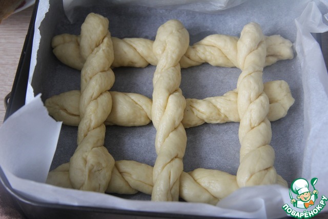 Уложить жгутики в форму в виде решетки. Накрыть полотенцем и поставить в тепло до увеличения объема.