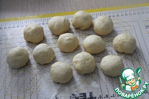 Тесто разделить на равные части, скатать шариками. Я, изначально, разделила на 12 частей, но потом объединила и сделала всего 6 шариков. Если хотите делать тонкие жгутики, то делайте их больше.