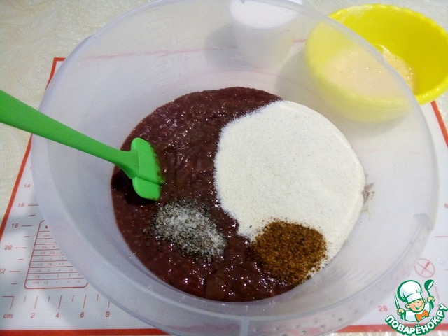 Печень промыть, просушить, убрать все пленочки и прожилки. Печень можно взять любую, у меня свиная. Я предварительно подержала ее в холодном молоке 2 часа, чтоб ушла горечь и кровяной привкус. Перекрутить печень через самую мелкую решетку. Добавить манную крупу, соль, перец и базилик, я добавляла базиликовую соль. У нас есть на сайте, как ее приготовить. Хорошо все перемешать.