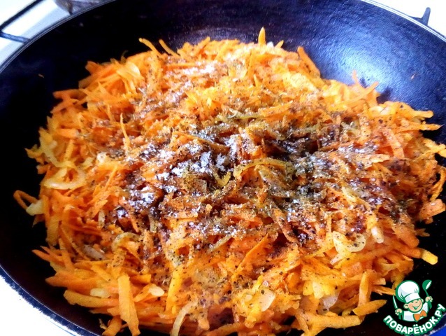 Тем временем, приготовим луково-морковную прослойку. Лук нарезать полукольцами, слегка обжарить в разогретом на сковороде масле. Добавить морковь, натертую на крупной терке, перемешать, добавить соль, перец, прованские травы и влить воду, перемешать, накрыть и тушить под крышкой на маленьком огне до мягкости и испарения жидкости, не забывая периодически помешивать, минут 10. Для любителей, можно добавить острый перчик, а так же-свои любимые специи.