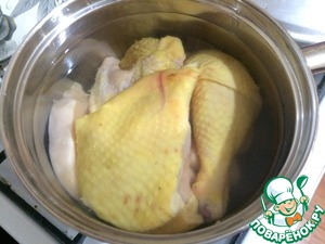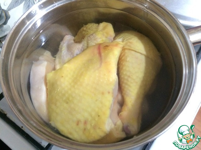 Приступаем к приготовлению курицы и соуса. Кусочки курицы заливаем холодной водой и ставим на огонь. Даём прокипеть курице секунд десять, сливаем "грязную" воду, промываем кусочки курицы горячей водой.