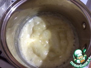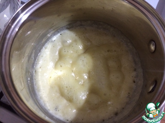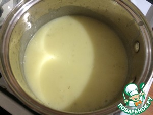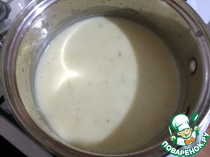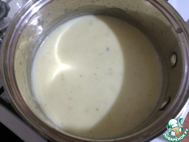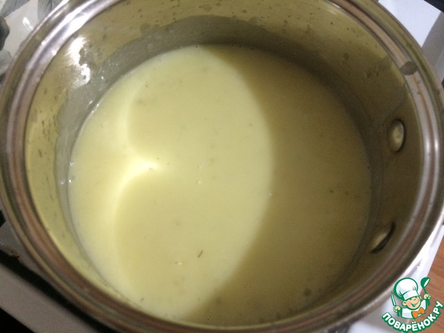 В кастрюлю с мукой тонкой струйкой добавляем наш бульон, всё время помешивая. У нас должна получиться однородная, довольно густая масса. Помешивая прогреваем пару минут.