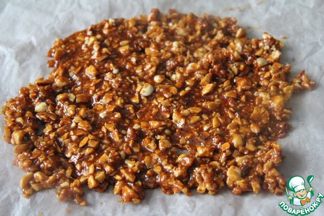 Сахар растопить на сковороде и дождаться, пока он не приобретет янтарный цвет. Всыпать в расплавленный сахар рубленные орехи, перемешать. Вылить массу на пергамент или силиконовый коврик. Дать полностью остыть и затвердеть. -