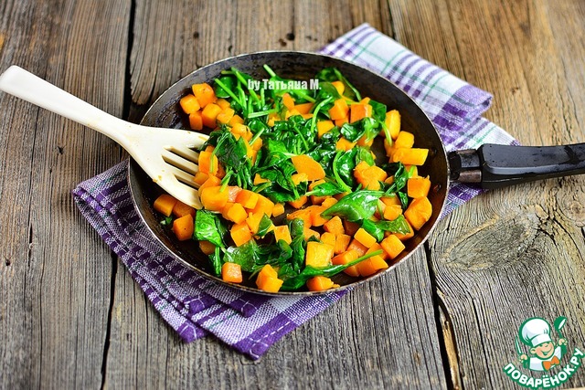 Добавить шпинат и размягчить его с тыквой, помешивая.