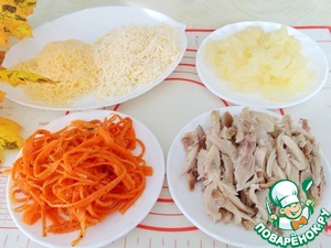 Приготовить начинку. Натереть на средней терке сыр или несколько видов. Ананас вынуть из сиропа на салфетку и просушить, нарезать по кругу тонкими кусочками. Нарезать отварное мясо курицы, у меня бедрышки, можно любое. Приготовить самим или купить корейскую морковь, если много сока, отжать.