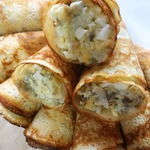 Каждый блинчик разрезать пополам, уложить начинку, понемногу каждого из ингредиентов, полить слегка майонезом или можете взять йогурт, сметану, добавив немного горчицы и свернуть блинчик с начинкой конусом.