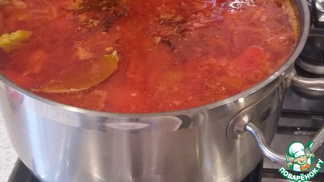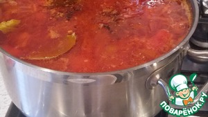 Помидор порезанный и очищенный от шкурки добавляем в зажарку и перец болгарский порезанный крупными кубиками притушиваем еще минуты 4. Добавляем в кастрюлю зажарку, перец горошком, лавровый лист и доводим до кипения, варим минут 5.