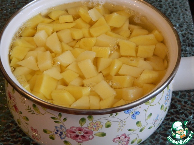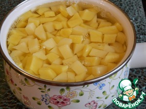 Нарезанный кубиками картофель кладем третьим по счету и так же варим еще 5 минут.
