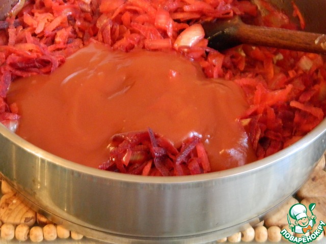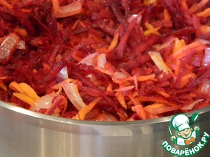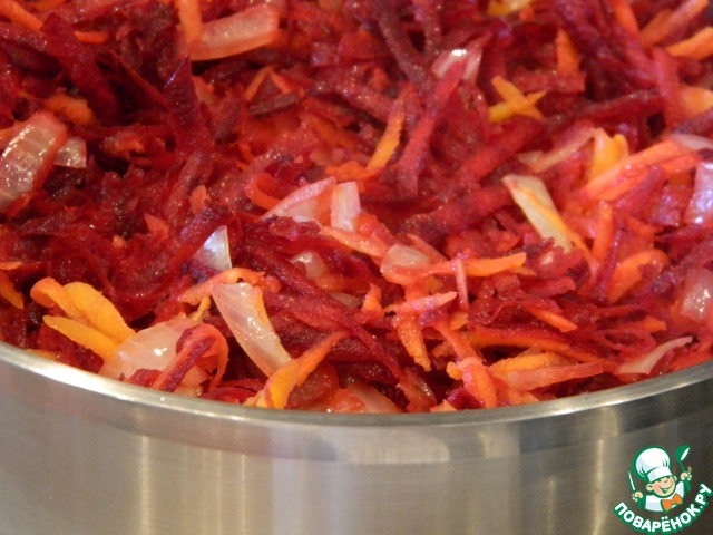 Обжарим лук, морковь, свеклу с таким же интервалом.