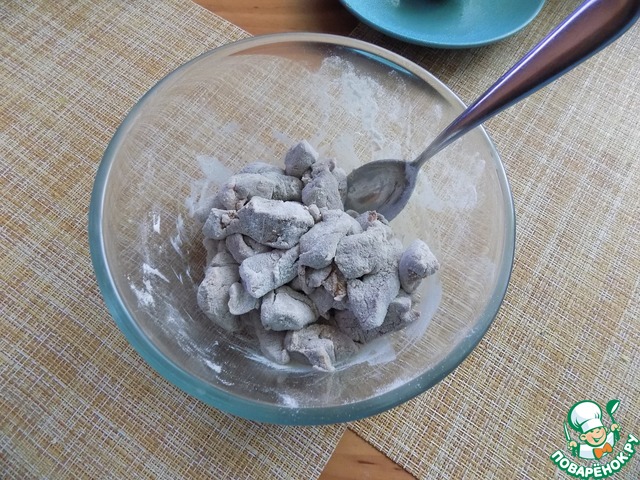 Обваливаем каждый кусочек в муке. Я использовала для этого ложку.