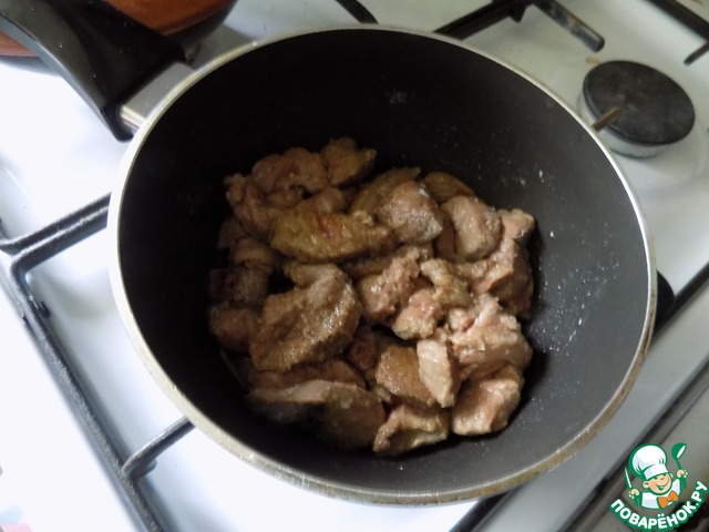 На сковороду наливаем масло, греем его и выкладываем печень. Обжариваем её совсем немного, до красивого цвета. Перекладываем печень в посуду, где её потом будем тушить.