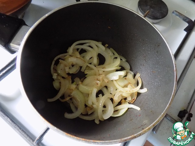 На эту же сковороду, где обжаривалась печень, выкладываем лук порезанный (опять так же, как любите вы резать). Золотим лук. Не нужно его сильно жарить.