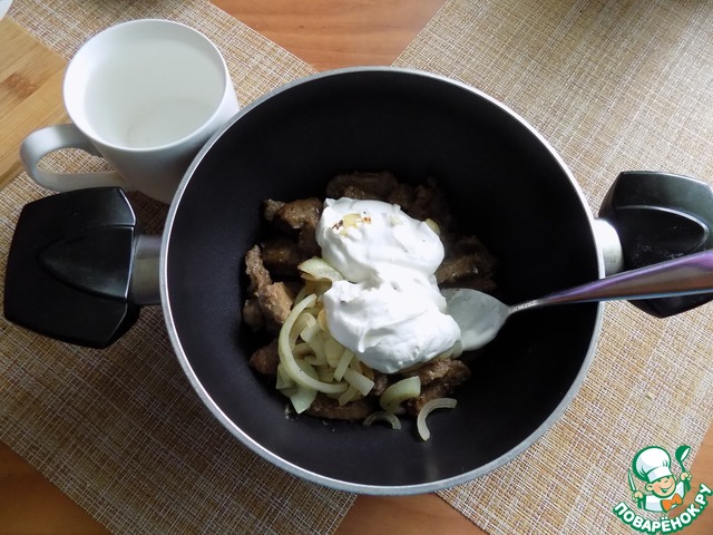 Лук отправляем к печени в кастрюлю, добавляем сметану и горячую воду.