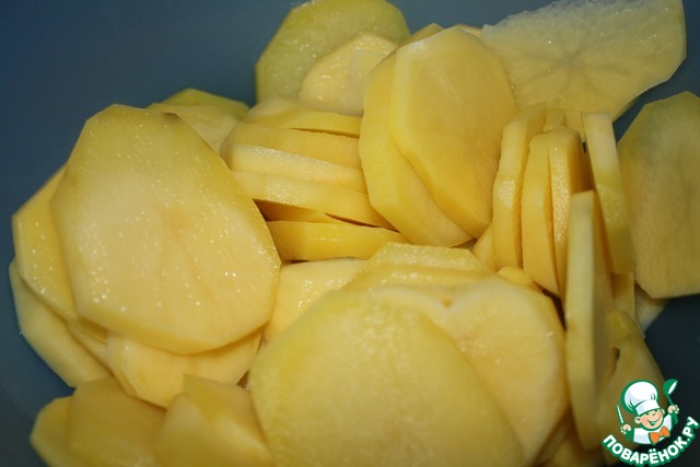 Картофель нарезать тонкими шайбами и залить кипятком на 10 мин.