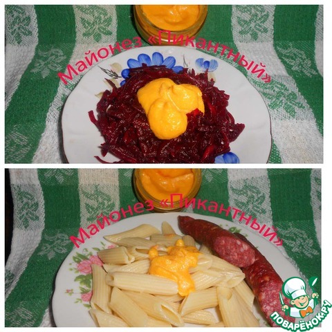 Этот соус можно использовать, как и классический майонез. Но блюдо, заправленное им, - гораздо ярче по вкусу и цвету. Майонез получается густой, хорошо держит форму, не "течёт", очень хорош на бутербродах, в любых салатах. А ещё мясо или рыба, смазанные таким соусом перед запеканием, имеют превосходные вкус, аромат и очень аппетитный вид. P.S. Кроме того - соус готовится без яиц. Это безопасность, и подходит для использования в пост.