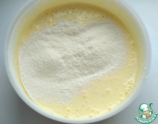 Частями просеять муку, аккуратно вымешивая лопаткой или венчиком.