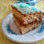 Сложить половинки друг на друга смазанными сторонами. Получается уже и яблочная прослойка и крем между ней. Чем тоньше будет корж, тем лучше будет чувствоваться яблочный слой, да и есть такой торт будет удобнее)