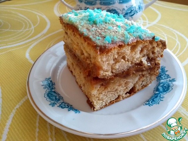 Сверху тоже обмазать сгущенкой или любым кремом, украсить по желанию, я посыпала стружкой горького шоколада. Бисквит получается пористым по структуре, не сухим, но и не влажным, - что то среднее. Яблочная прослойка придает нужную влажность и сочность тортику. Торт можно подавать сразу, разрезав на порции. А можно выдержать час или больше, он вкусен в любом случае.
