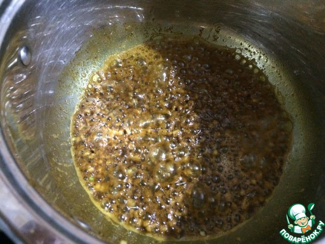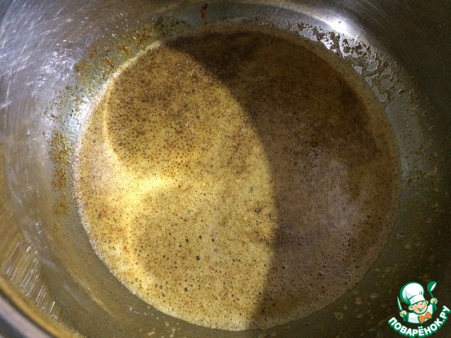 Наливаем в глубокую посуду растительное и сливочное масло. Добавляем семена горчицы и обжариваем 1 минуту. Затем добавляем чеснок, паприку, кориандр, перец чили, куркуму, корицу, чёрный перец (всё молотое) и обжариваем в течение 30 секунд. Всё время обжарки специй перемешиваем, не переставая.