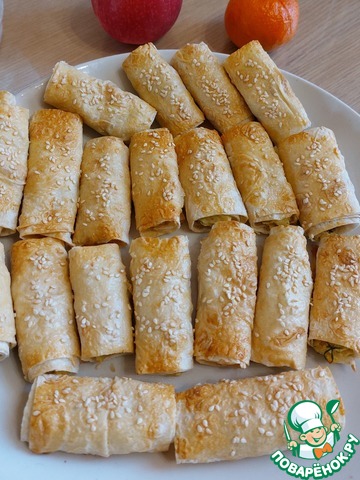 Смазываем трубочки яйцом и посыпаем кунжутом.
