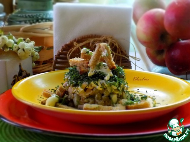 Идею салата увидела в одной из социальных сетей. Назывался он "Дрова на траве". Я изменила немного состав салата, да и сухари чёрные сделала свои и по-своему. Сытный, вкусный, красивый салат, который можно поставить на праздничный стол. Салат с маринованными огурцами, которыми запаслись многие в сезон и потихоньку начали есть с осени.