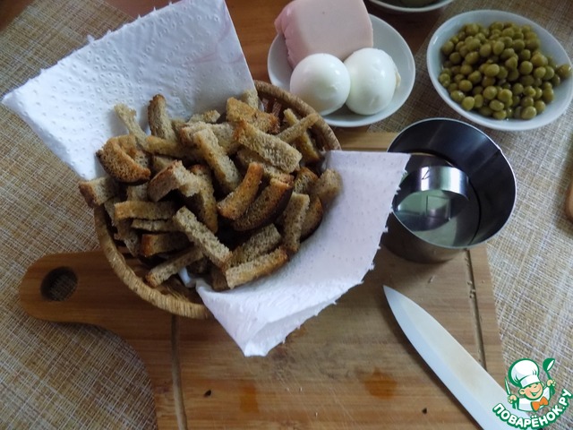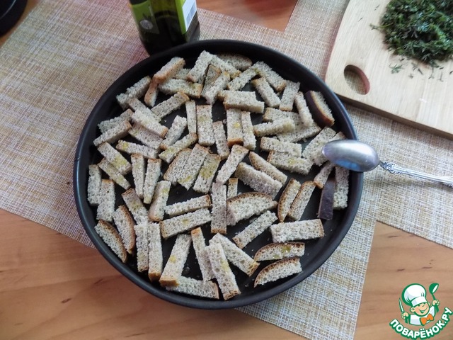 Ставим варить яйца вкрутую. Делаем сухарики. Нарезаем 2 куска Дарницкого хлеба брусочками, величиной в ширину половины куска хлеба и толщиной примерно 07-1 см. Выкладываем на противень или как я, в форму. Раскладываем ровным слоем, поливаем оливковым маслом, присыпаем немного солью, не забывая о майонезе и соленых огурцах и присыпаем чуть сухим укром. Ставим в духовку разогретую до т-200 С примерно на минут 5. Увидите, когда сухарики красиво зарумянятся и подсушатся. Вынимаем из духовки и даём им остыть.