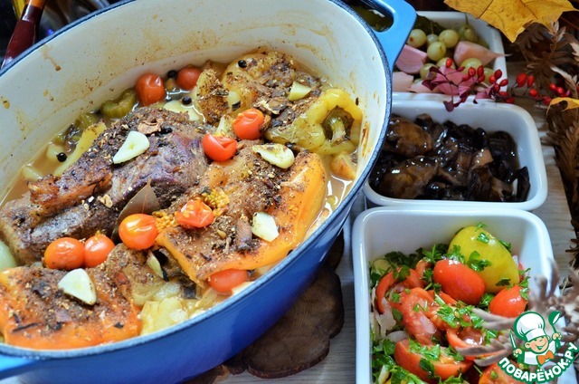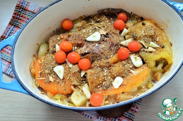 Затем добавить чеснок и черри, грибы сушёные молотые и лавровый лист, посолить по вкусу. Запекать ещё 1 час. -