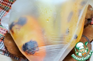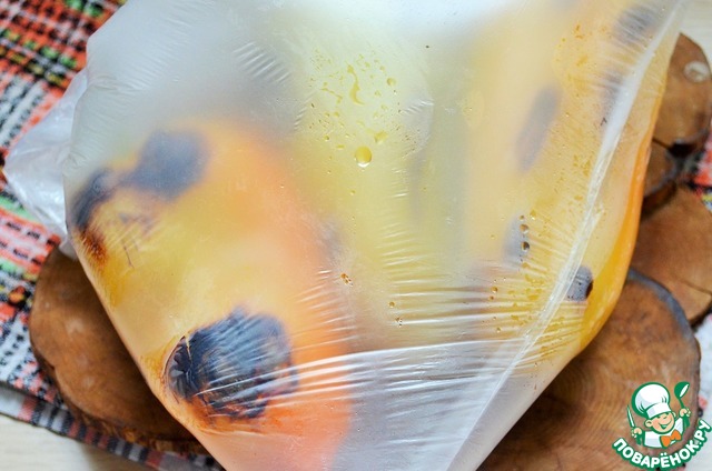 Поместить перец в пакет и под полотенце, минут на 15. Затем очистить от плёнки.