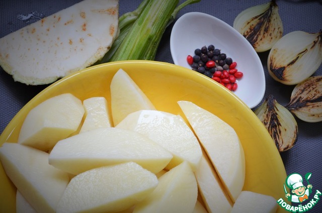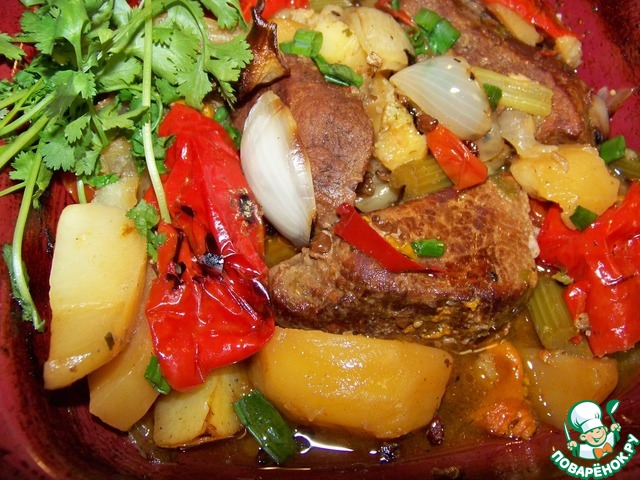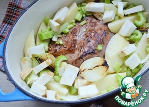 В казан или жаровню выложить мясо, картофель, оба вида сельдерея, лук.