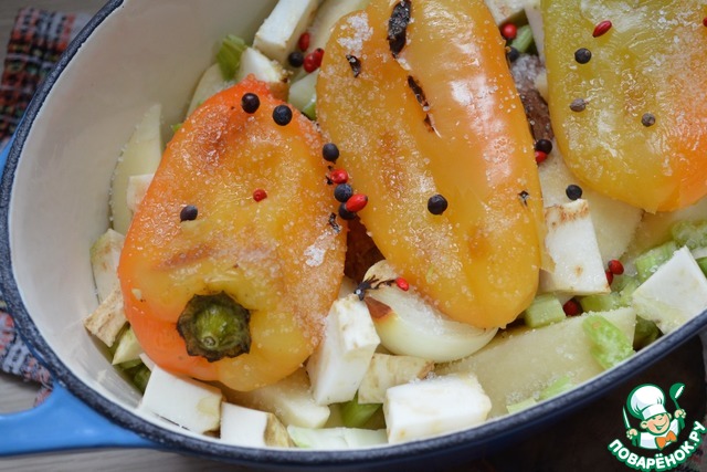 На мясо положить перцы, посолить, добавить ягоды, влить 200 мл кипятка.