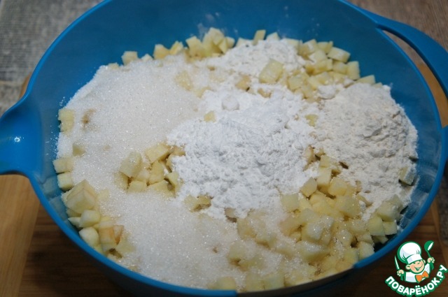 Почистить яблоки, нарезать кубиками (это самая нудная операция при приготовлении этого пирога). Пересыпать сахаром, солью, мукой и крахмалом, перемешать. Поставить в микроволновку на 12 минут, перемешивая каждые 3 минуты (можно это сделать и на плите). Яблоки должны остаться целыми и стать прозрачными на концах. Оставить остывать.