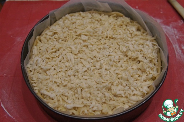 Духовку разогреть на 180*С. 2/3 теста раскатать и выложить дно и стенки формы d 23-24 см.
