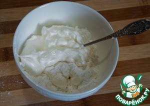 Приготовьте белый соус. Смешайте сливочный сыр со сметаной и сахарной пудрой.