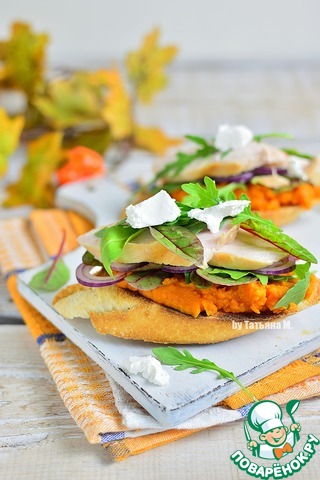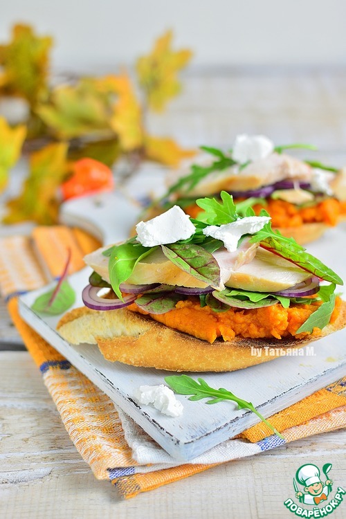 Основа этой яркой, вкуснющей чесночной брускетты - ароматное тыквенное масло, которое впрочем очень легко приготовить! Остальные ингредиенты можно подбирать по своему вкусу, у меня это промаринованная и жареная куриная грудка, сыр Фета и зелень!