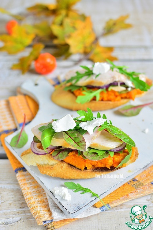 На багет намазать тыквенное масло, уложить зелень (у меня рукола, мангольд, что то там еще), затем лук тонкими колечками, затем кусочки грудки и немного крошенной феты.
