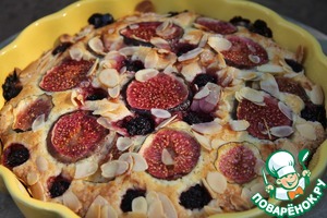 Форму смазать маслом и присыпать мукой. Вылить тесто, уложить нарезанный инжир и ежевику. Присыпать сахаром и миндальными лепестками.
