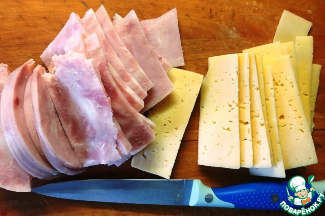 Для начинки нарезать тонкими ломтиками ветчину и сыр.