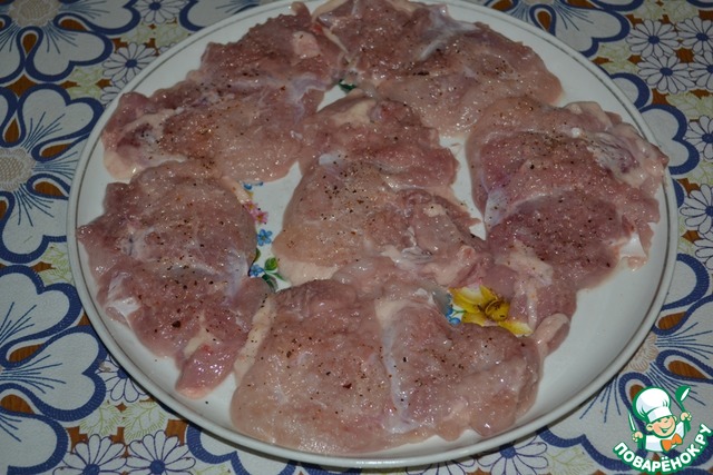 И так, куриное филе слегка отбить с одной стороны, с той, с которой сняли шкурку. Поперчить смесью перцев и слегка присолить. На время убрать в холодильник, пока будем готовить начинку.