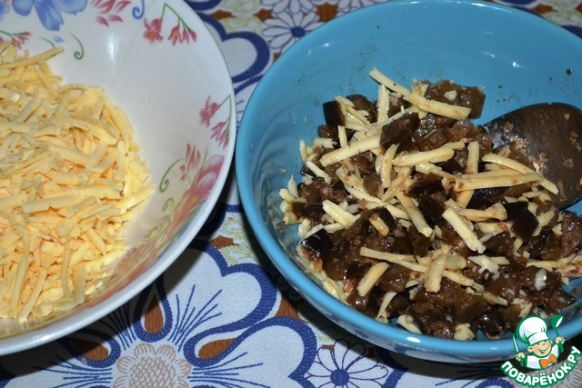 Сыр натереть на крупной тёрке. Положить в баклажановую начинку 3 столовых ложки сыра с горкой, перемешать. Остальное накрыть пищевой плёнкой и убрать на время в холодильник.