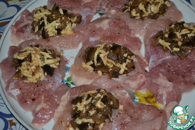На одну часть куриного филе выложить по столовой ложке начинки, не доходя до края 1 см.