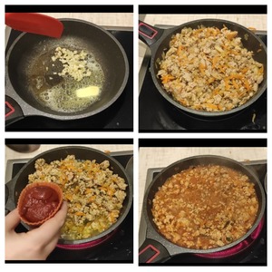 В разогретую сковородку кладем масло и чеснок. жарим на умеренном огне до золотистой корочки (3-5 минут.) Затем добавляем лук и морковь. Жарим так же не много 5-7 минут. После - добавляем фарш, обжариваем минут 10 периодически помешивая. Затем отправляем туда томатную пасту, солим, перчим, добавляем часть зелени - все хорошенько перемешиваем и убираем с огня.