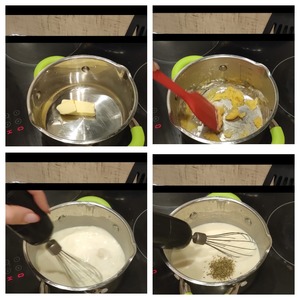 Теперь займемся соусом. в разогретую кастрюлю отправляем масло, после чего добавляем муку - перемешиваем. Затем постепенно вливаем молоко и перемешиваем все, чтобы не было комочков. затем добавляем прованские травы и соль - буквально 1 минуту пока не закипит соус. Как только соус загустел и закипел - снимаем с огня.