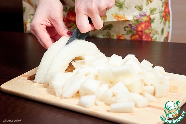 Порезать крупными кубиками. Не мельчите, а то превратиться в кашу.